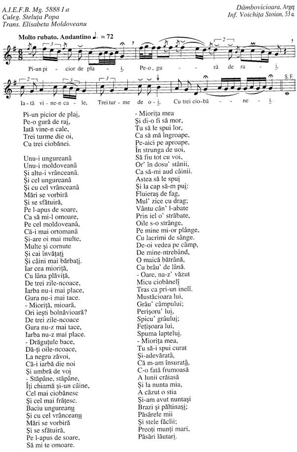 In cultura romaneasca, tema "Miorita" a fost indelung analizata, atat sub aspect muzical, cat si literar. Despre Miorita au observat poetii, literatii, eseistii, filosofii. Aria de raspandire a acestor teme cuprinde intreg teritoriul romanesc, iar identificarea unor structuri mai diverse sau mai variate ale celor cunoscute apar tot mereu in cadrul culegerilor din ultima vreme. Culeasa de Alecu Russo si publicata de V. Alecsandri in revista "Bucovina", in anul 1852, Miorita se gaseste consemnata in peste 2000 de variante de text, cele mai multe fiind textele literare, iar balada in sine purtand uneori denumirea de poveste cantata.