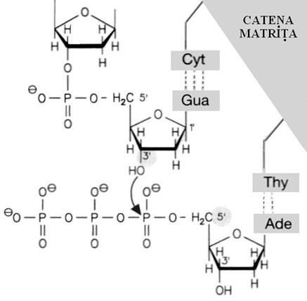 Energia necesara procesului provine din legaturile fosfat tmacroergice ale nucleotidelor folosite. Pirofosfatul rezultat este desfacut in 2 molecule de fosfat impingind reactia ireversibil spre dreapta. Replicarea continua astfel pana la intalnirea unei noi unitati de origine.