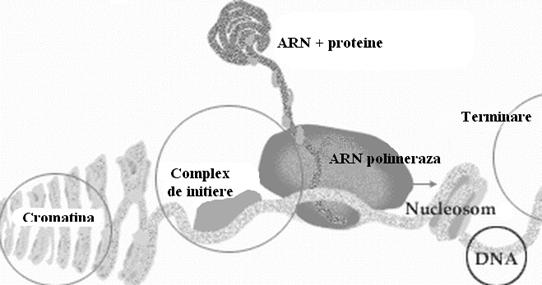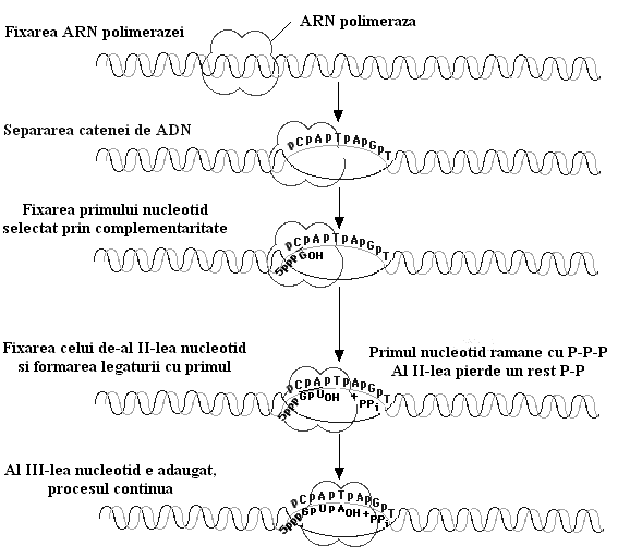 Deci transcriptia reprezinta sinteza ARN-ului mesager. Structura acestuia este dictata de matrita ADN-ului copiat (gena). Aceasta matrita sau portiune de ADN numita gena se poate afla pe oricare dintre cele 2 catene ale ADN-ului si este transcrisa in functie de necesitatile proteice ale fiecarei proteine.