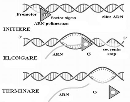 a. Transcrierea informatiei pe ARN necesita la inceput un semnal de initiere. Deci ARN-polimeraza se fixeaza pe o portiune a ADN-ului numita promotor. Acest locus promotor este constituit din aproximativ 40 de perchi de nucleotide specifice inceputului fiecarei gene. Mai exista o secventa de 6 nucleotide situata inaintea celei dintai care mareste exactitatea initierii transcrierii, si un factor sigma care creste afinitatea enzimei pentru promotor.