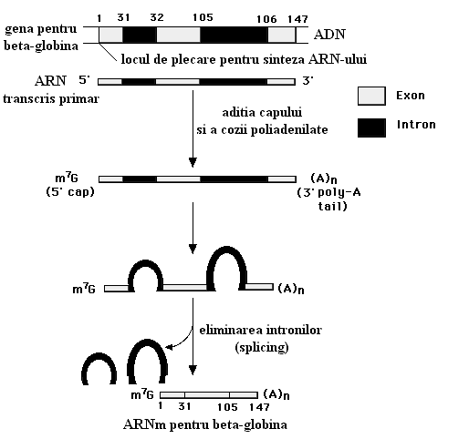ARN-ul mesager astfel obtinut difera la procariote fata de eucariote. Astfel in ARN-ul procariot molecula este continua deci intreaga informatie de aici poate fi folosita pentru sinteza proteinelor. In ARN-ul eucariot s-a observat prezenta unor portiuni repetitive de nucleotide numite introni care nu detin nici o informatie pentru sinteza proteica. Acesta este motivul pentru care ARN-ul mesager primar este mult mai lung decat ARN-ul mesager folosit de ribozom. Deci intronii trebuie excizati si pastrate doar portiunile cu informatie utila numite exoni.