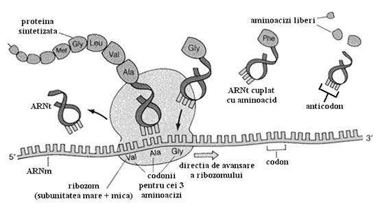 La nivelul ribozomului fiecare codon se potriveste cu anticodonul complementar de pe ARNt si aceasta este modalitatea prin care aminoaciziii sunt adusi in ordine, uniti prin legaturi peptidice si transformati in proteine.