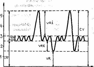 Suma dintre VER si VR reprezinta capacitatea reziduala functionala (CRF) cu o valoare de aproximativ 2 300 ml.
