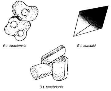 Diversele tulpini de Bacillus thuringiensis au diferite forme de cristale (figura 2.) si diferite varietati de toxine. De exemplu, DiPel contine cel putin patru toxine, în timp ce XenTari contine cel putin trei. Indiferent de forma, toate cristalele contin toxine.