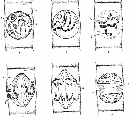 În profaza mitozei (fig. 10) cromozomii se scurteaza si se îngroasa, iar învelisul nuclear se dezorganizeaza. În metafaza cromozomii se dispun în planul ecuatorial al fusului de diviziune (mitotic). În anafaza cele doua cromatide ale fiecarui cromozom se separa, astfel ca devin cromozomi fii, iar loturile de cromozomi fii se îndeparteaza migrând spre câte un pol. În telofaza loturile de cromozomi fii ajung la câte un pol celular, dupa care se alungesc si redevin fibre subtiri, iar învelisul nuclear se reorganizeaza.