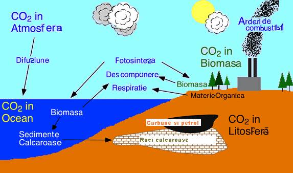 Dioxidul de carbon intra în apa marilor si oceanelor printr-un mecanism simplu de difuzie. Odata dizolvate în apa de mare, dioxidul de carbon ramâne asa cum e sau se poate modifica în carbonati (CO3-2) sau bicarbonati (HCO3-). Diverse forme de animale marine fixeaza bicarbonatii cu calciu (Ca+2) pentru a produce carbonat de calciu (CaCO3). Aceasta substanta este folosita pentru repoducerea scoicilor sau a altor parti ale vietuitoarelor marine cum ar fi: coralii, racii, stridiile, câteva protozoare, si câteva alge. Când aceste organisme mor, învelisul scoicilor si diverse parti ale corpului se scufunda pe fundul marilor si oceanelor acumulându-se în depozite bogate în carbonati. Dupa lungi perioade de timp, aceste depozite sunt considerate din punct de vedere fizico-chimic roci sedimentare. Depozitele din mari si oceane constituie de departe cele mai mari rezervoare de carbon ale planetei - dupa cum se vede si în tabel.