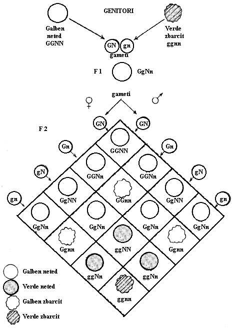 Mendel a incrucisat doua soiuri de mazare, unul cu bob neted si galben (NNGG), ambele caractere dominante si unul cu bob verde si zbarcit (nngg), ambele caractere recesive. In prima generatie a obtinut numai plante cu bob galben si neted (NnGg). Prin autopolenizarea plantelor din prima generatie, a obtinut in generatia a doua F2, urmatorul raport de segregare: 9/16 plante cu bob neted si galben, 3/16 plante cu bob zbarcit si galben, 3/16 plante cu bob neted si verde si 1/16 plante cu bob zbarcit si verde (Fig. 2.2).