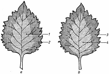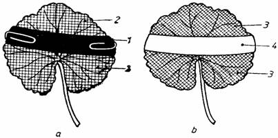 Fig. 37. Demonstrarea necesitatii luminii īn procesul de fotosinteza: a - frunza de Pelargonium acoperita cu hārtie neagra (1) si expusa la lumina (2); b - aceeasi frunza dupa efectuarea probei cu iod; 3 - zone albastre; 4 - zona necolorata.