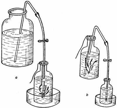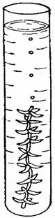 b) Necesitatea prezentei luminii pentru desfasurarea fotosintezei poate fi pusa īn evidenta si cu ajutorul plantelor superioare submerse. Se ia o ramura a unei plante acvatice submerse (Elodea, Ceratophyllum, Myriophyllum), se sectioneaza oblic la partea bazala astfel ca sa se obtina un fragment de 6-10 cm lungime si se introduce cu vārful īn jos īntr-o eprubeta umpluta cu apa de conducta. Se fixeaza ramura cu ajutorul unei baghete de sticla astfel ca partea sectionata sa se gaseasca sub nivelul apei si sa nu atinga peretii eprubetei. Se aseaza eprubeta cu ramura īntr-un stativ la lumina. Dupa 2-3 minute se va putea constata ca prin partea sectionata a ramurii īncep sa se degaje bule de gaz. Eliminarea bulelor de gaz prin partea sectionata a ramurii se explica prin faptul ca oxigenul care se formeaza īn procesul de fotosinteza difuzeaza mai usor īn spatiile intercelulare ale frunzelor si de acolo īn aerenchimul ramurii, decāt direct īn apa din eprubeta prin stratul de cuticula de la nivelul epidermei si, ca rezultat, se degaja sub forma de bule de gaz prin partea sectionata a ramurii, prin care aerenchimul acesteia comunica cu exteriorul īn urma sectionarii (fig. 38).