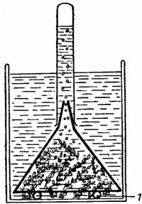 Pentru determinare se leaga ramurile alese cu o ata, la partea lor bazala si se introduc repede īntr-unul din recipientele de sticla, astfel ca sa se gaseasca īn pozitie normala si ca extremitatea libera a atei sa iasa prin gātul recipientului, dupa care se umple imediat recipientul cu apa pregatita pentru determinare. Pentru a evita modificarea continutului de oxigen solvit al apei īn timpul umplerii recipientului, umplerea se face prin sifonare (fig. 42). Īn acest scop se foloseste un tub de sticla īndoit īn V si prelungit la una din extremitati cu un tub de cauciuc prevazut cu o clema. Se introduce tubul de sticla, cu capatul lipsit de tubul de cauciuc, īn vasul īn care se afla apa pregatita pentru determinari si dupa ce se absoarbe apa prin capatul lui opus, se īnchide clema de pe tubul de cauciuc, care īn timpul absorbtiei de apa a fost tinuta īn pozitie deschisa si se introduce capatul liber al tubului de cauciuc pāna la fundul sticlei cu planta, pentru ca īn timpul umplerii ei cu apa sa nu se produca nici o barbotare.