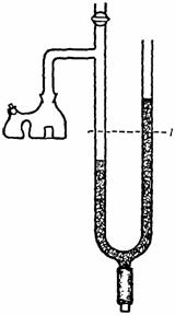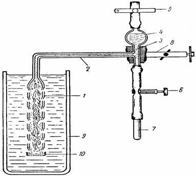 Pentru determinare se foloseste un dispozitiv (fig. 43), care poate fi confectionat din sticla, alcatuit dintr-un tub colector (1) cu lungimea de 12-14 cm si diametrul de 1,5-2 cm, care prezinta un sir de orificii laterale, ce se prelungeste cu un tub capilar (2) aflat īn pozitie orizontala (lung de circa 12-14 cm), care se continua cu un alt tub capilar, aflat īn pozitie verticala (3). Tubul capilar vertical prezinta īn partea superioara o portiune dilatata, īn forma de sfera (4), iar la extremitatile lui se fixeaza cāte un tub de cauciuc, prevazut cu cāte o clema Hoffmann (5 si 6). Tubul de cauciuc de la extremitatea inferioara a capilarului se astupa cu o bagheta de sticla (7). Pentru lucru, dispozitivul se fixeaza īn clema unui stativ (8), astfel ca tubul colector sa fie scufundat īn īntregime īn apa aflata īntr-un pahar Berzelius (9).
