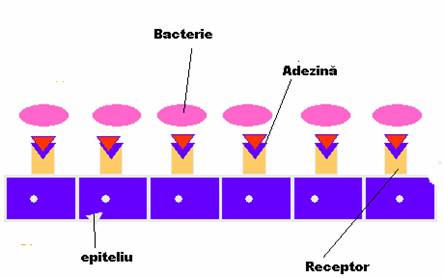 Aderenta microbilor de organismul gazda presupune prezenta unei sau mai multor adezine microbiene prezente pe peretele bacterian si un receptor pe celula eucariota. Adezinele bacteriene sunt fimbriile si adezinele nefimbiale.