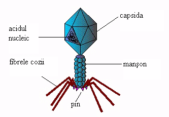 Morfologie. Bacteriofagii sunt formati dintr-un cap hexagonal, un gat si o prelungire numita picior (coada). Capul este alcatuit dintr-un invelis proteic (capsida) si adaposteste ADN. Coada este un cilindru rigid invelit intr-un manson proteic asemanator miozinei si se termina cu o placa hexagonala ce contine o enzima de tipul lizozimului. De placa bazala se aprind 6 fibre cu rol in fixarea bacteriofagului pe suprafata bacteriei.