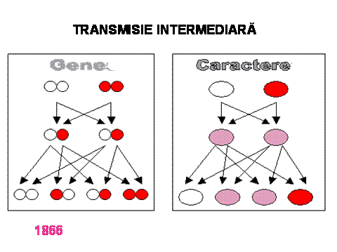 Într-una din ele (exceptional de rara),numita transmisie intermediara cele doua componente au o putere de a se impune egala. In acest caz exemplarele din prima generatie prezinta toate o varianta mixta(flori roz).În cadrul celei de a doua generatie rezultata din împerecherile plantelor cu flori roz ,vor reapare potrivit legii segregarii alaturi de plante cu flori mixte roz si unele plante cu flori rosii si altele cu flori albe (50% vor fi cu flori roz,25% cu flori rosii si 25% cu flori albe ).