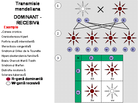 În cea de a doua posibilitate(mult mai obisnuita) numita transmisie dominant-recesiva una din componente(cea referitoare la flori rosii)pe care Mendel a numit-o dominatoare (va fi denumita ulterior dominanta) are o putere de a se transmite (de a se impune) mai mare decât componenta referitoare la flori albe pe care a denumit-o recesiva. În acest caz toate plantele din prima generatie vor avea flori rosii,iar în cele din a doua generatie 75% din ele vor avea flori rosii iar 25% flori albe. În acest caz variante intermediare(mixte,roz)nu vor apare niciodata Pentru ca sa apara flori albe trebuie prin jocul hibridarilor sa se realizeze un exemplar homozigot cu ambele gene recesive pentru alb.(cu alte cuvinte trebuie sa lipseasca gena dominanta)