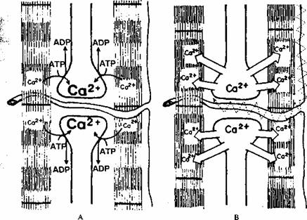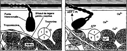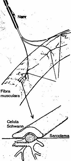 Transmiterea informatiei de la neuronii motori spre fibrele musculare (ca organ cfector) se realizeaza printr-o structura specializata numita placa motorie (fig. 2.15). Butonul terminal al neuronului motor este separat prin fanta sinaptica de sarcolcma fibrei musculare. Impulsul nervos ajuns la nivelul butonului terminal determina eliberarea neuromediatorului aceticolina. Legarea mediatorului de receptori determina cresterea permeabilitatii pentru sodiu, urmata de depolarizarea sarcolemei (potential local de placa). Depolarizarea sarcolemei de la nivelul placii motorii conduce la generarea potentialului de actiune.