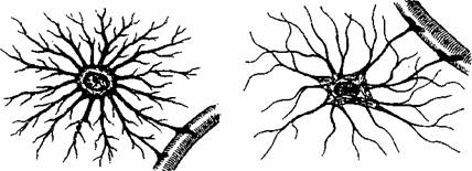 Fig. 2.16. Exemple de nevroglii asa cum pot fi evidentiate în impregnarile argentice. De remarcat doar ca astrocitele au pedicul vascular.