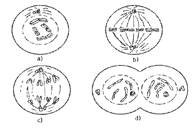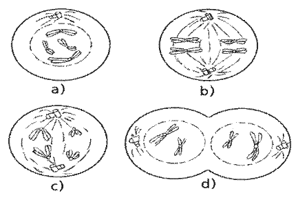 a) profaza; b) metafaza; c) anafaza; d) telofaza.