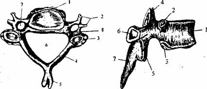 Prezinta corpul vertebral cel mai mic si alungit transversal; procesele transverse au la baza gaura transversara iar pe fata lor superioara se afla santul pentru nervul spinal, procesul spinos este apropiat de orizontala, procesele articulare orientate între planul orizontal si frontal, iar gaura vertebrala este triunghiulara (fig. 3.2).