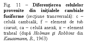 Cambiul. Formeaza o teaca cilindrica unistrata in lungul radacinii si tulpinii (inel in sectiune transversala) si, prin diviziuni alternative ale initialelor fusiforme, genereaza spre interior lemn (xilem) secundar si spre exterior liber (floem) secundar (fig. 11). Celulele lui sunt mai ales alungite pe directia axului (prozenchimatice). Fac exceptie doar celulele cambiale care prin diviziuni alternative produc atat spre interior cat si spre exterior parenchim al razelor medulare. Aceste celule sunt parenchimatice si se numesc initiale de raza ale cambiului.