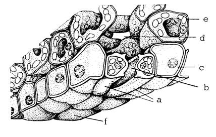 Fig. 12 Stomata in epiderma unei frunze: a celule stomatice sectionate; b ostiola; c celule anexe; d camera substomatica; e parenchim lacunar; f celule epidermice (din Raven, P. H. si colab., 1992)
