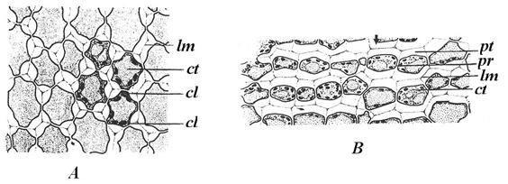 a. Colenchimul. Este constituit din celule vii ce au numai pereti primari, cu ingrosari neuniforme din celuloza si substante pectice. Poate fi colenchim angular, cand ingrosarile sunt la colturi sau colenchim tabular (fig. 16), cand numai peretii tangentiali sunt ingrosati.