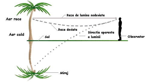 Modificarea densitatii aerului vara, pe timp frumos, explica acele unduiri ale aerului de deasupra suprafetelor metalice sau a terenurilor proaspat arate, având loc o deviere diferita a razelor refractate