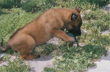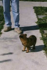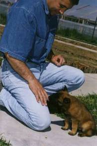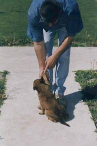 Acest exercitiu se incepe din pozitia CULCAT. Cu stimulul inca in mana dreapta, aproape de nasul cainelui, in timp ce-i dati comanda PE LOC, ridicati si indepartati mana astfel incat puiul sa se ridice in picioare si, de indata ce face asta, recompensati-l. Unii dintre pui s-ar putea sa aiba nevoie de putin ajutor si incurajare. Intr-un mod delicat, ca sa nu-l speriati, bagati-i mana stanga sub burtica si ajutati-l sa se ridice, timp in care, repetand comanda, cu mana dreapta efectuati miscarea descrisa mai sus. Nu intarziati sa recompensati puiul de indata ce efectueaza exercitiul. Si mai ales, nu-l plictisiti si nu-l obositi cu prea multe repetari. |