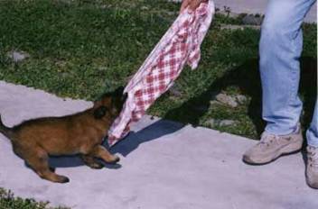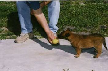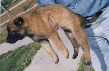 Din pozitia asezat a puiului, cu stimulul in mana dreapta, coboriti cu viteza mana in fata labelor anterioare ale puiului, dandu-i comanda CULCAT. Lasati pumnul usor intredeschis, in asa fel incat el sa poata mirosi stimulul. In cazul in care nu se lasa pe labele din fata in pozitia CULCAT, ajutati-l tragandu-i labele spre inainte, astfel incat puiul sa alunece usor in CULCAT. |