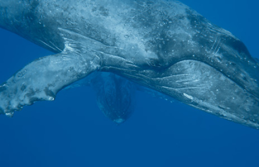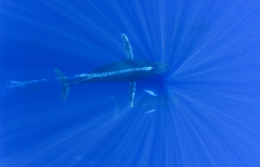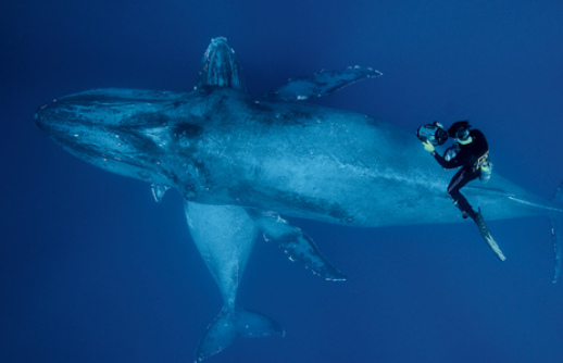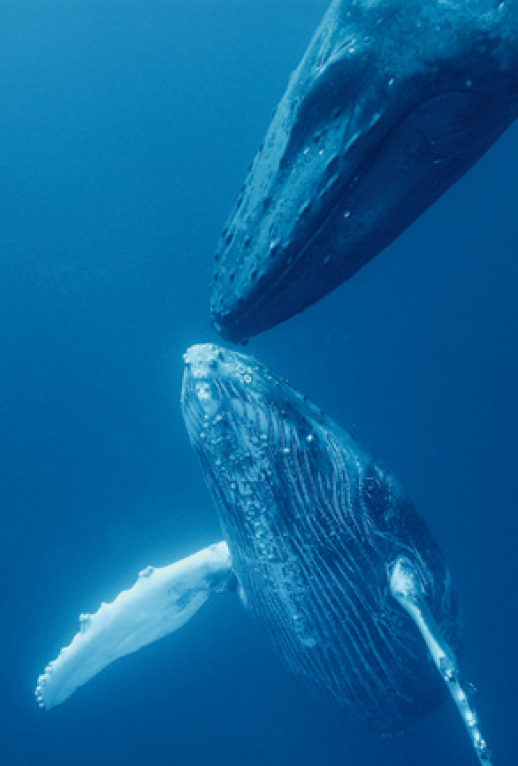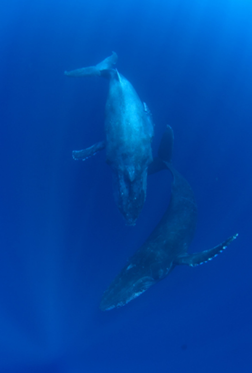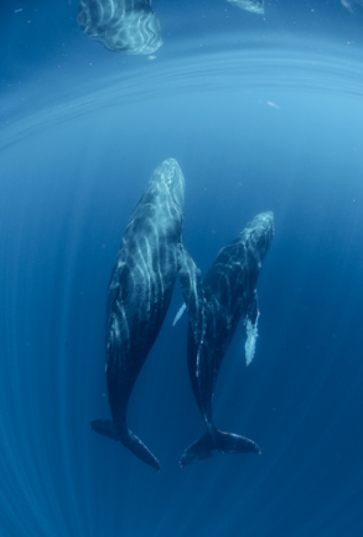 Īntr-o dupa-amiaza, la 15 metri adāncime īn azurul orbitor, un pui de balena-cu-cocoasa se odihneste, vārāt sub īnotatoarea mamei lui, apoi se muta pentru a se cuibari īn urmatorul lui loc preferat: sub gātul ei. Un al doilea adult da tārcoale prin apropiere. Pielea īntunecata, plina de cicatrice si zgārieturi, sugereaza ca este un mascul.