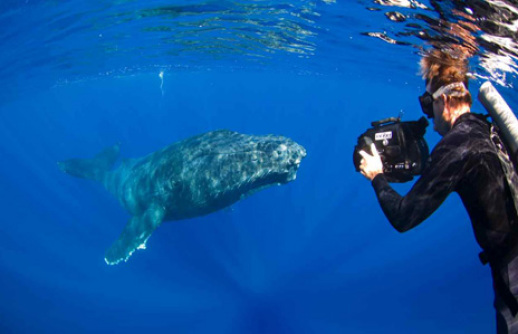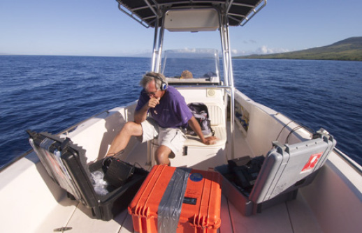 Jones opreste motorul si īsi pozitioneaza ambarcatiunea deasupra balenelor si usor īn lateral. Jason Sturgis, de la Whale Trust, īsi da drumul fara zgomot de pe platforma de la pupa, cu dispozitivul de snorkeling. La mai putin de jumatate de kilometru distanta, o a doua ambarcatiune coboara un difuzor īn apa si īncepe sa emita o mostra de sunete foarte nemuzicale - grohaituri, huruituri, murmure, rāsete sarcastice si smiorcaituri -, pe care le scot masculii īn grupurile competitive. Sturgis īnregistreaza reactia femelei cu o camera video.