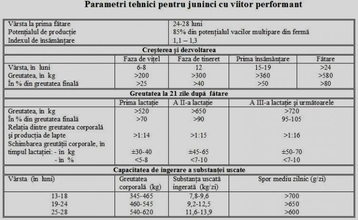 Parametrii ce trebuie realizati, dupa reputatul specialist german dr. Peter Gestad, de catre tineretul femel din rasa Holstein, pentru obtinerea unor productii ridicate de lapte si a unei bune longevitati īn exploatare sunt prezentati īn tabelul de mai jos: