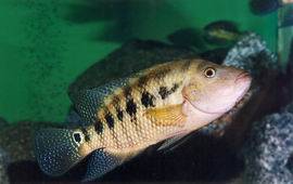 Este una din speciile cel mai frecvent intalnite din familia Cichlidae. Corpul pestelui este robust si turtit lateral, botul ascutit, dorsala si anala terminate intr-un fir subtire la mascul. Caudala este rotunjita asemeni unui evantai. A doua radie a pectoralelor este foarte lunga. Masculul atinge 15 cm, femela fiind mai scurta. Culoarea de baza este galben-verzui, sau galben-gri spalacit. Incepand de la varful botului si pana la aripioara dorsala se intinde o dunga inchisa la culoare. Pe partile laterale se pot vedea uneori dungi verticale care se compun din niste pete mai intunecate. La baza cozii se afla o pata neagra, tivita pe margine cu alb. Masculul are un colorit mai viu, mai ales in ceea ce priveste pata albastra dintre pectorale. Orificiul genital al femelei este mai pronuntat, in special in etapa premergatoare reproducerii, cand se unfla vizibil. Cresterea acestui ciclid necesita un acvariu mai luminos, cu multe plante si locuri de ascunzis formate din pietre.