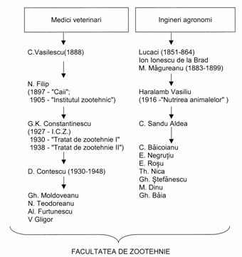In figura 3 sunt prezentate cele doua filiatii de fondatori ai domeniului, cu principalele lor realizari, pana la aparitia Facultatii de Zootehnie.