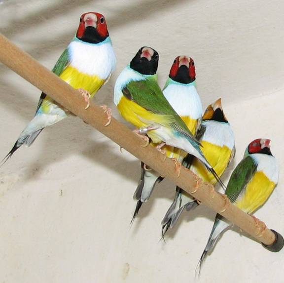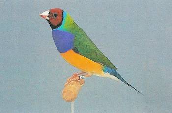 capul ,neagra,rosie si galbena.La femela culorile sunt mai pale si nu are dunga albastra in jurul gatului.Gulzi sunt foarte sensibili la temperatura care nu are voie sa fie mai mica de 20 de grade,la reproducere 22-23 de grade