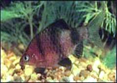 Acest peste, de culoare galbuie-murdara pe laturi si albicioasa pe partea ventrala, are pe corp trei dungi negre late si o pata neagra pe pedunculul caudal. Coloritul lui se schimba insa in timpul reproducerii, cand aripioarele masculului devin negre, iar botul rosiatic, la ambele sexe.