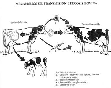 Virusul se transmite in mod obisnuit pe cale orizontala, prin intermediul instrumentarului nesterilizat, a manusilor pentru exploratii transrectale reutilizate, a acelor de tuberculinare, al sangelui/limfocitelor infectate, iar in climatul cald, posibil, prin insecte hematofage. Raspandirea relativ redusa catre efective invecinate sugereaza necesitatea unui contact prelungit si apropiat intre animalele bolnave si cele sanatoase. Transmiterea orizontala nu este caracteristica in cazul transferului viral de la bovine la ovine si nu exista dovezi ale transmiterii BLV la om. Transmiterea pe verticala este demonstrata prin prezenta infectiei la 10% din vitei la fatare (.), cu toate ca alti autori neaga importanta transmiterii transuterine, considerand-o practic neglijabila si pledeaza pentru transmiterea prin colostru sau lapte ().