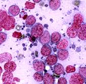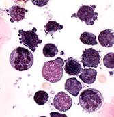 Fig.1. Aspectul histologic al aspiratului din limfonoduri, de la vaci cu limfosarcom. Se observa limfocite numeroase, cu o rata mare a raportului nucleu/ciroplasma si nuclei ovali cu cromatina fina. In fundal sunt prezenti nuclei goi, picaturi citoplasmatice si eritrocite (https://www.vet.uga.edu/vpp/clerk/collins/index.php).