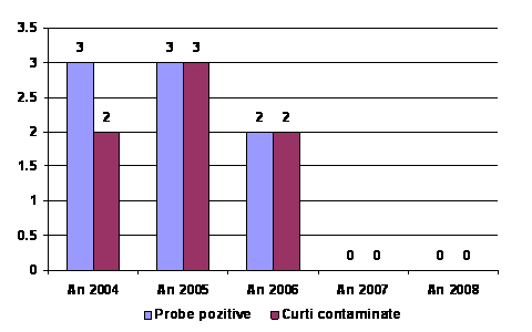 Graficul 3. Dinamica probelor pozitive si a curtilor contaminate din localitatea Boiu in intervalul 2004-2008