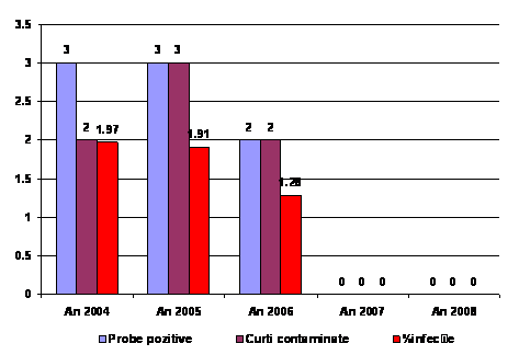 Evoluția procentului de infectie este redata in graficul 4 si urmeaza aceeasi dinamica ca si cea a numarului de probe pozitive. La controlul serologic efectuat in primavara anului 2007 nu au mai fost depistate vaci pozitive.