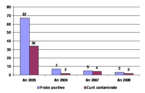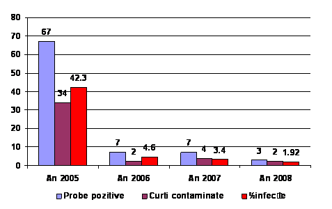 In graficul 7, sunt redate dinamica probelor pozitive si a numarului de curti contaminate. In localitatea Ciumeghiu, boala a fost diagnosticata pentru prima data in primavara anului 2005, cand au fost depistate 67 de vaci pozitive pentru LEB, in 34 de curti contaminate, care au si fost ulterior eliminate. La controlul din 2006, au mai fost depistate 7 probe pozitive, in 5 curti contaminate, care au fost eliminate. In 2007 au mai fost depistate 5 cazuri noi, iar in 2008 inca trei cazuri pozitive la LEB, repartizate in 4, respectiv 2 curti contaminate. Toate animalele depistate pozitiv au fost eliminate astfel: in 2005 - 54 de bovine; in 2006 - 17 bovine din care 11 din cele din anul anterior; in 2007 - 7 bovine, dintre care 2 din anul anterior, iar in 2008 - 2 bovine, ramanand un animal depistat pozitiv neeliminat.