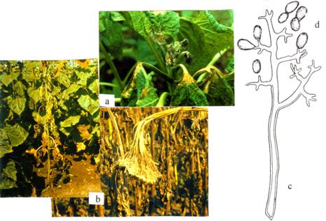 Conidioforii sunt hialini, ies în fascicule în grupe de 2-6 si sunt ramificati monopoidal în partea superioara. (Fig. 46) Ramificatiile se termina cu 2-4 sterigme de care se prin conidii unicelulare, hialine, ovoide de 19-30x15-26µ, cu membrana subtire si continut citoplasmatic. Conidiile sunt luate de vânt si sunt transportate pe alte frunze sau pe sol unde germineaza dând nastere la zoospori biflagelati. Acestia emit filamente de infectie care patrund în tesuturile plantei.