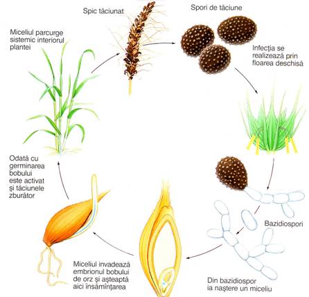 Ciclul evolutiv. In timpul īnfloritului, clamidosporii sunt luati de vānt si ajung pe florile de orz. In conditii de umiditate si la o temperatura optima de18-23°C, ei germineaza producānd cāte o probasidie scurta, cilindrica alcatuita din 4 celule haploide, uninucleate, de sexe diferite (la germinare a avut loc meioza). (Fig. 29)