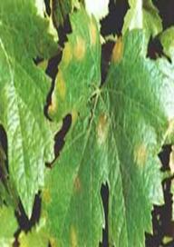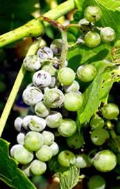 Simptome. Ciuperca ataca frunzele, lastarii ierbacei, ciorchinii si boabele, din primavara pana toamna tarziu.