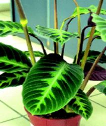 Calathea zebrina (foto) se recunoaste prin desenele in tonuri diferite de verde, dungile fiind mai pronuntate, de nuanta inchisa, si pornesc de la nervura centrala intr-o directie aproape orizontala.