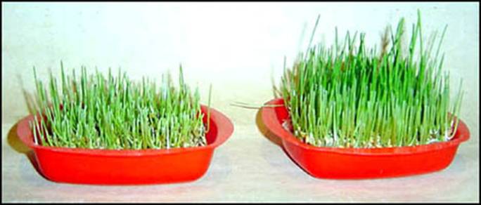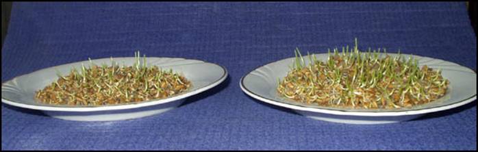Cele doua mostre cu grau au fost udate la aceeasi ora, cu aceeasi cantitate de apa, stanga cu apa normala iar dreapta cu apa diamagnetica diluata 1 / 500. Rezultatele au aratat ca la incoltire apa diamagnetica (AqD) are tendinta de a frana procesul. Dupa ce a incoltit graul a avut o crestere rapida vizibil in poza.