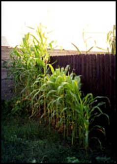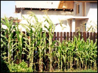 Vara anului 2003. Cultura de porumb in curte, in stanga porumb udat cu AqD la dilutie 1 / 1000, dreapta udata cu apa normala ( in afara apei provenite de la ploaie ). Un aspect important trebuie remarcat, porumbul a fost udat in perioada neploioasa de doua ori la o saptamana.