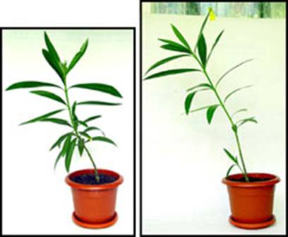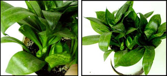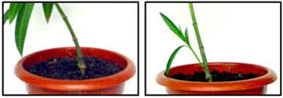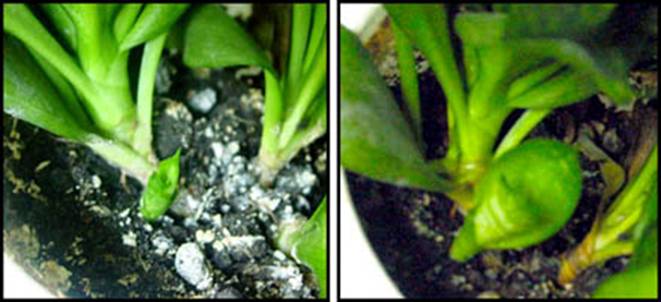 Imaginea din fig.5 - a este facuta pe data de 10.06.2005. Asa cum era de asteptat ( din experientele anterioare ) AqD provoca planta sa produca noi lastari. In mod normal planta din imagine are o crestere lenta insa prin udarea cu AqD ritmul de crestere a fost semnificativ marit si se remarca in imaginea din fig.5 b ( poza din data de 02.07.2005 ) faptul ca in aproximativ doua saptamani lastarul s-a marit considerabil. Modul de administrare al AqD a fost de 1/1000 dilutie o data la saptamana.