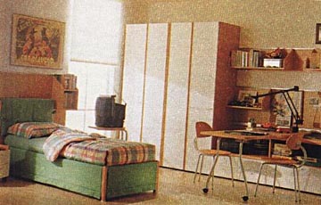 cat si pentru asezarea cartilor si a caietelor de scoala. Patul este asezat paralel cu linia dulapului si a etajerelor.