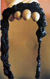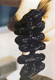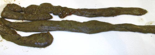 Aceasta placa are o culoare neagra-verzuie si seamana bizar cu cauciucul intarit al unei anvelope ( vezi foto ). Placa mucoida poate varia considerabil in functie de starea chimica din intestinul persoanei respective. Poate fi tare si casanta; poate fi tare si densa, dura, umeda si elastica, moale, tare si lipicioasa, subtire si are diferite culori: de la cafeniu, negru, sau negru-verzui la galben sau gri si uneori emana un miros intepator. La temperatura de 37 grade placa incepe sa intre in descompunere raspindind toxine si otrava in circuitul sanguin si implicit in tot corpul provocind probleme de sanatate.